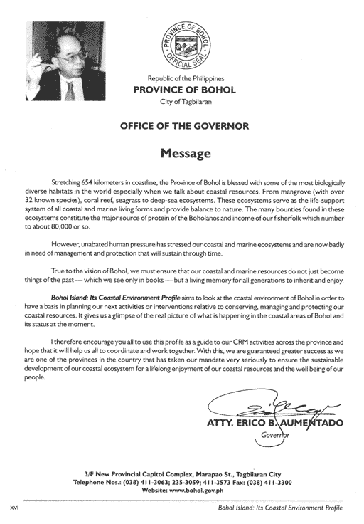 First of all, we include the forword to Bohol Island, Its Coastal Environment Profile, (published in 2002), an excellent study on the importance of protecting Bohol's coastal ecosystems, with numerous recommedations on the issue. A must-read for everybody interested in the issue. This study has been supported and funded by numerous organizations, including international donars such as the UNDP and USAid.